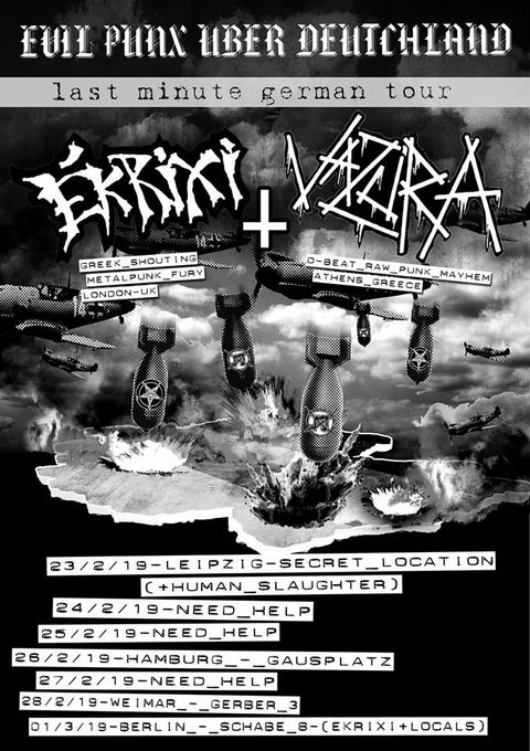 2 mal schnelles Geknüppel zum Donnerstag! Uns beehren EKRIXI aus London und VAZURA aus Athen. D-Beat, Raw Punk, Crust. Dazu gibt's auch etwas veganes zu futtern. Alles nur für ein paar Taler und auch zeitig vorbei, damit alle Working Class Heroes am Freitagmorgen ohne größere Schäden auf der Knechte stehen.
