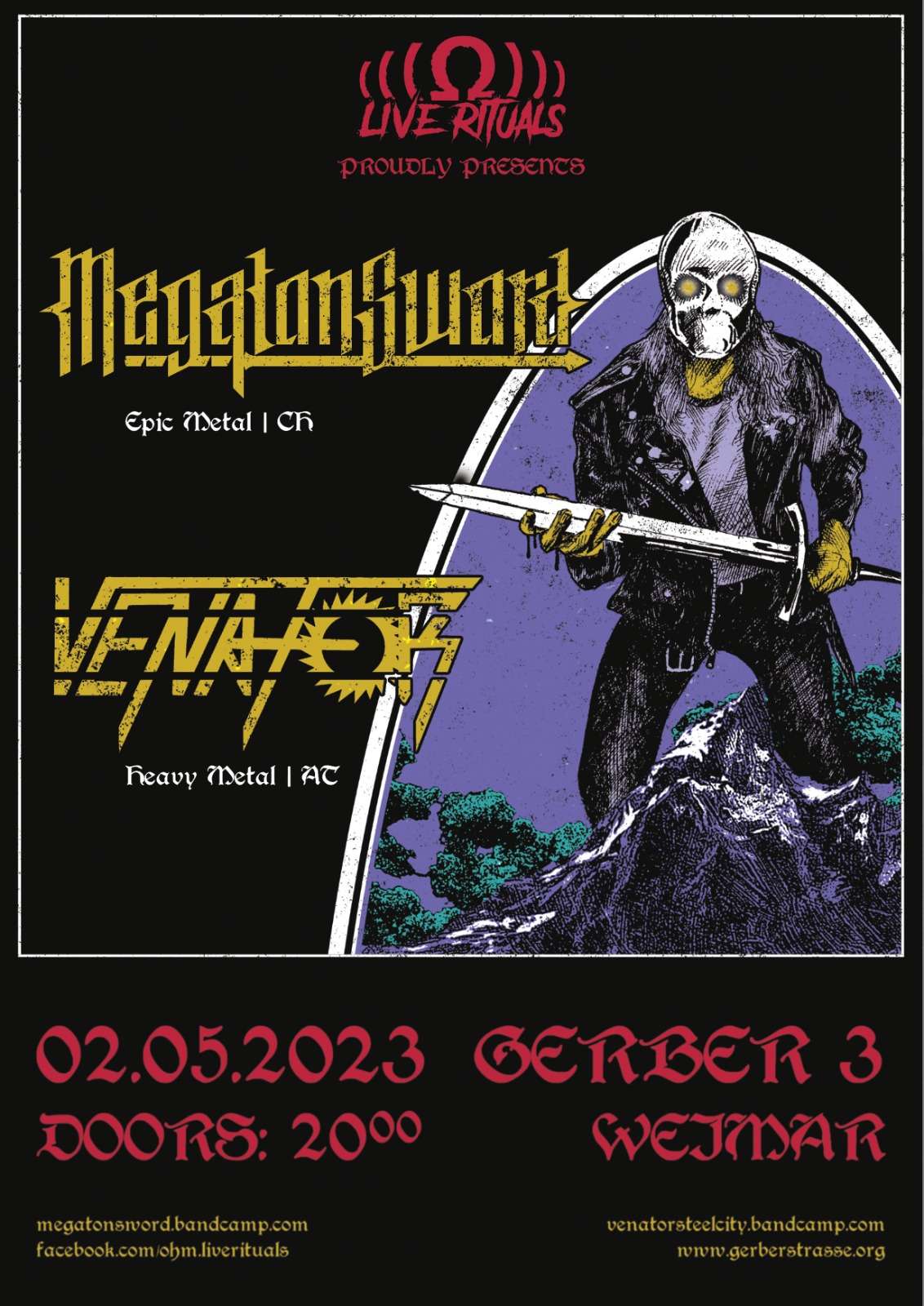Am Dienstag bringen die Leute von OHM Live Rituals mal wieder klassischen Heavy Metal in die Gerber! Venator und Megaton Sword ziehen marodierend durch die Lande, mal sehen, wie lange Weimar standhält.