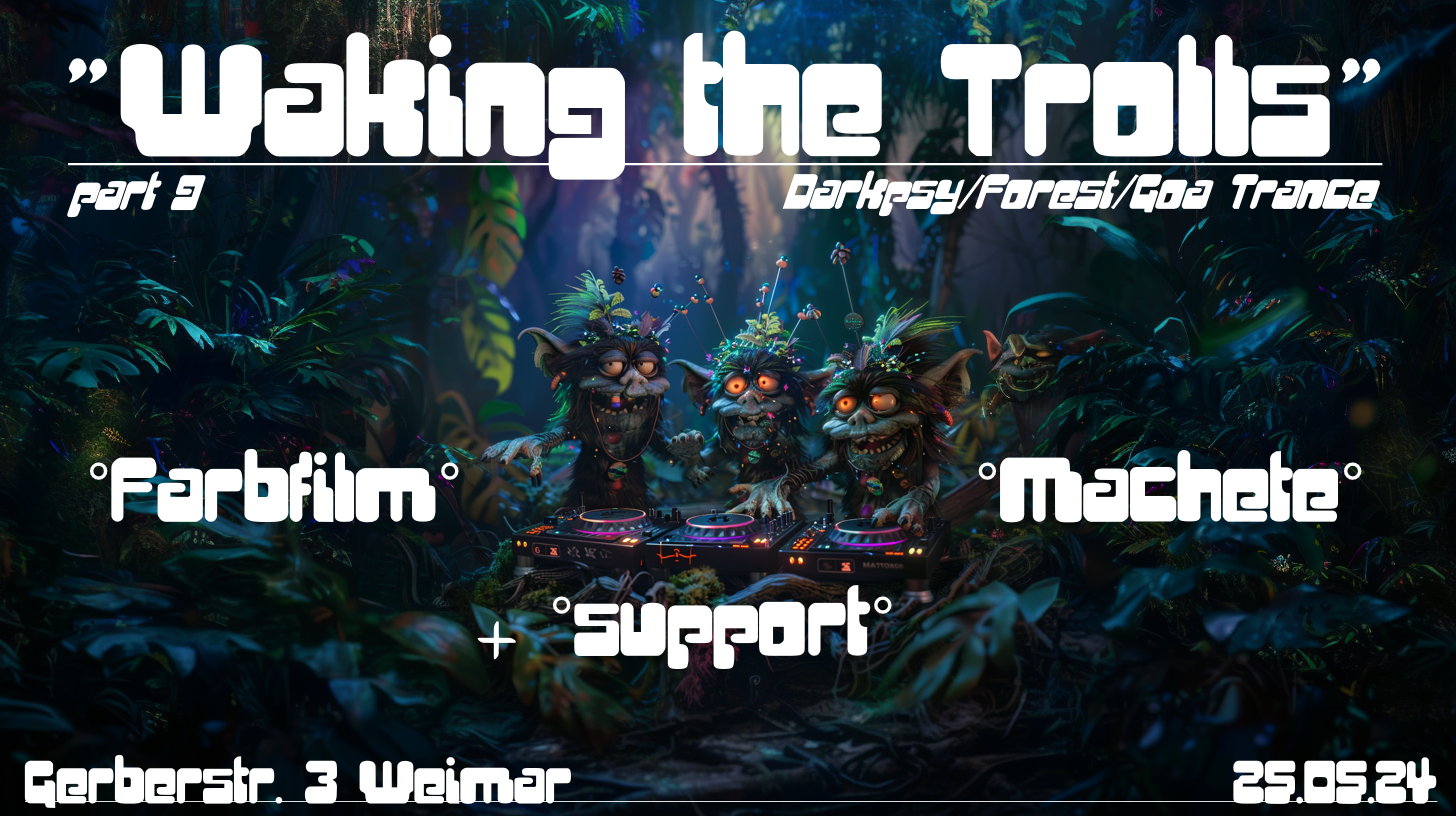 ‼️ Seid gegrüßt Psychonauts und Raveheads! Die Trolltribe Crew lädt Euch wieder ein diesen Samstag, den 25.05. mit uns zu feiern. Die neunte Edition unserer Psytrance Reihe "WAKING THE TROLLS" geht an den Start. Rollende Basslines, treibende HiHats und spacige Flächen bringen den Dancefloor in der WUNDERBAR wieder einmal zum Beben. Auf die musikalische Reise schicken Euch unsere Residents FARBFILM (https://soundcloud.com/farbfilm-1659475) , MACHETE (https://soundcloud.com/machete-314006581) und unser Support, welcher diesmal (noch) nicht verraten wird. Lasst Euch überraschen? Unsere Musik bewegt sich zwischen 135 und 160 BPM - und das ist auch gut so.
